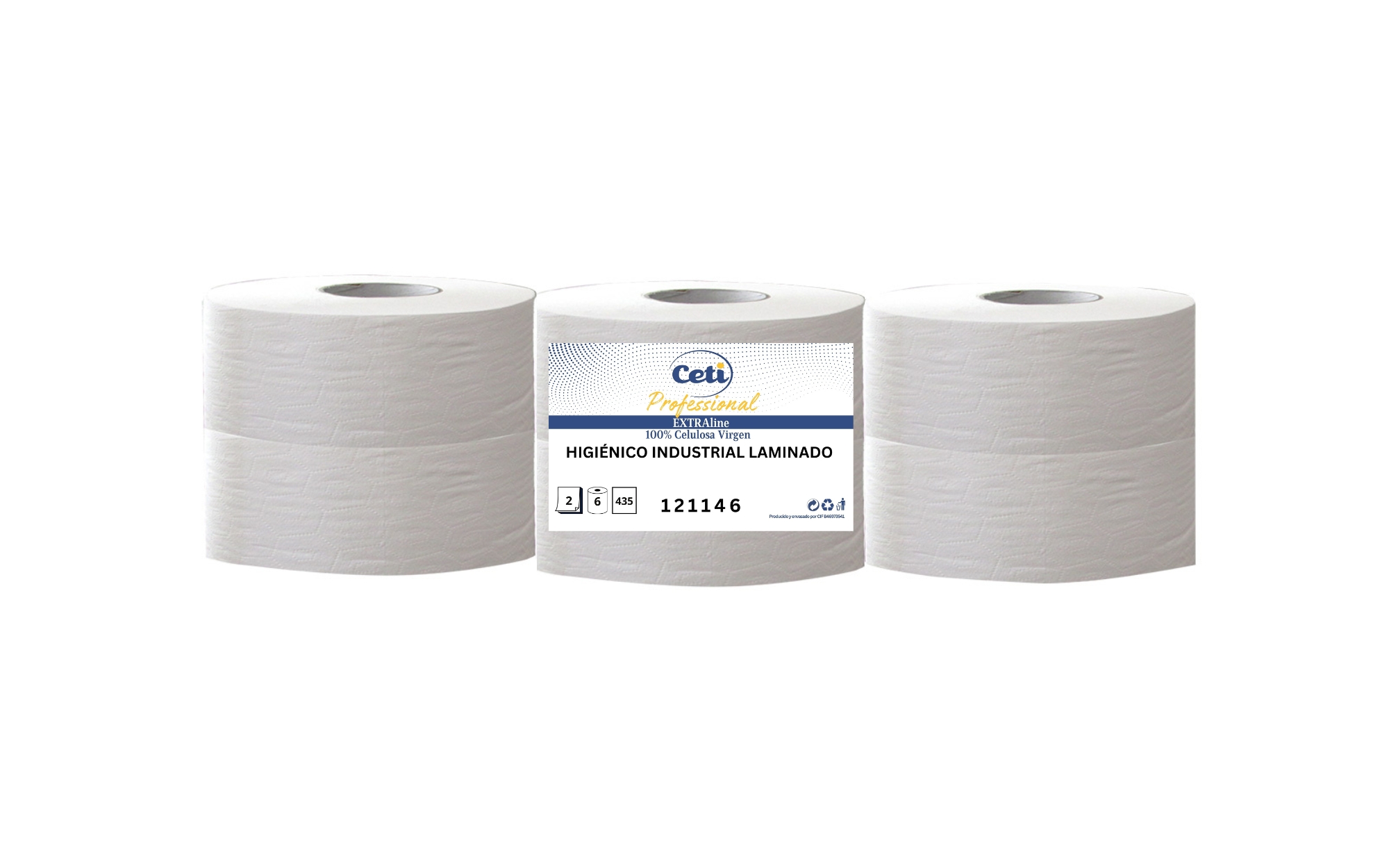 Papel higiénico industrial laminado fabricado a partir de celulosa virgen 100%, de 2 hojas y 130 metros de longitud, servido en packs de 6 y 18 rollos. Indicado para la higiene personal, ideal para utilizar en servicios de afluencia media-alta.